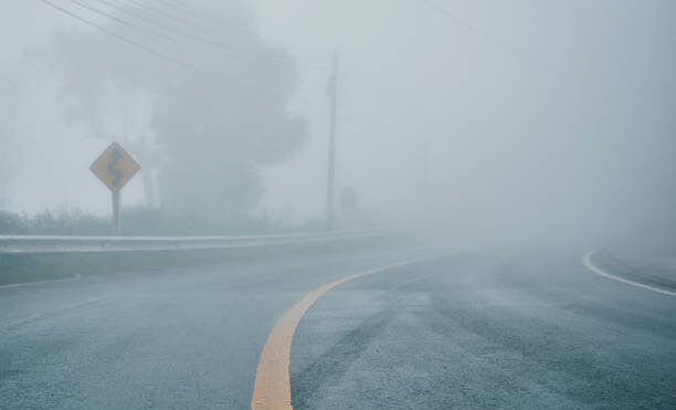 foggy rural asphalt highway perspective with white line, misty road, Road with traffic and heavy fog, bad weather driving