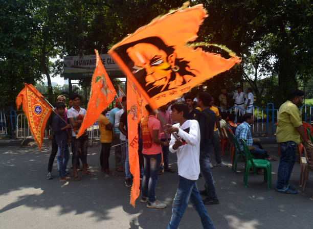 A member of The Bajrang Dal, the youth wing of the Vishva Hindu Parishad, is waving a flag featuring Hindu Lord Hanuman at a Shaurya Jagran Yatra event in Kolkata, India, on October 8, 2023. (Photo by Sudipta Das/NurPhoto via Getty Images)