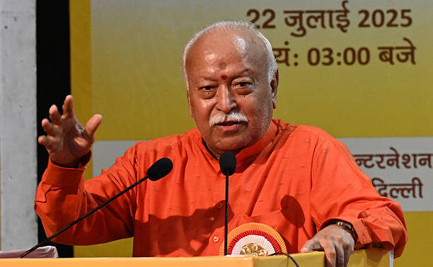 NEW DELHI, INDIA - JULY 22: RSS Chief Mohan Bhagwat speaks on the theme Issues of the World and Bharatiyata during the 10th Anuvrat Nyas Nidhi Vyakhyan organizing Indira Gandhi National Open University (IGNOU) and Akhil Bhartiya Anuvrat Nyas, at Dr. Ambedkar International Centre, on July 22, 2025 in New Delhi, India. (Photo by Sonu Mehta/Hindustan Times via Getty Images)